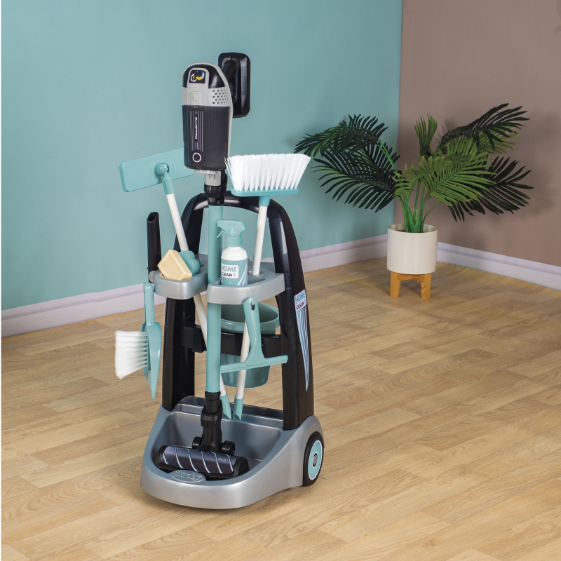- - Į rinkinį įeina 9 priedai, pavyzdžiui, semtuvėlis, šluota, šepetys, šluostė, kempinė, kibiras ir valymo priemonių imitacija.