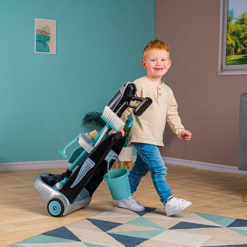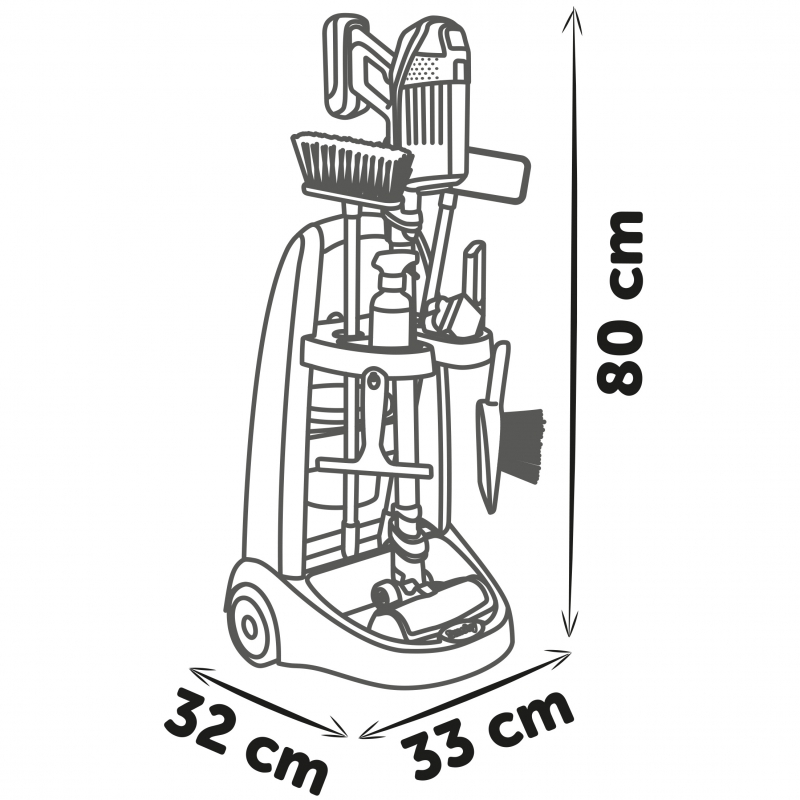 - - Rinkinį sudaro vežimėlis, ant kurio galime uždėti elektroninį dulkių siurblį, skleidžiantį tikroviškus dulkių siurbimo garsus, ir priedai.