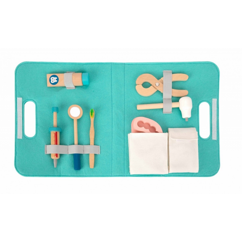 TOOKY TOY prekės ženklomediniai įrankiai maišelyje mažajam odontologui . Šiame rinkinyje yra viskas, ko reikia jūsų mažajam gydytojui žaisti odontologą. Būsimieji gydytojai gali atlikti injekcijas, šalinti dantis ir tikrinti savo pacientų dantų būklę. Žaidimas "Odontologas" yra ne tik vienas iš vaidmeninių žaidimų, bet ir moko apie higieną ir jos stokos pasekmes. Jis taip pat moko empatijos ir įsijautimo, kurie labai svarbūs socialiniuose santykiuose. Jis skatina vaizduotės vystymąsi ir moko spręsti problemas.